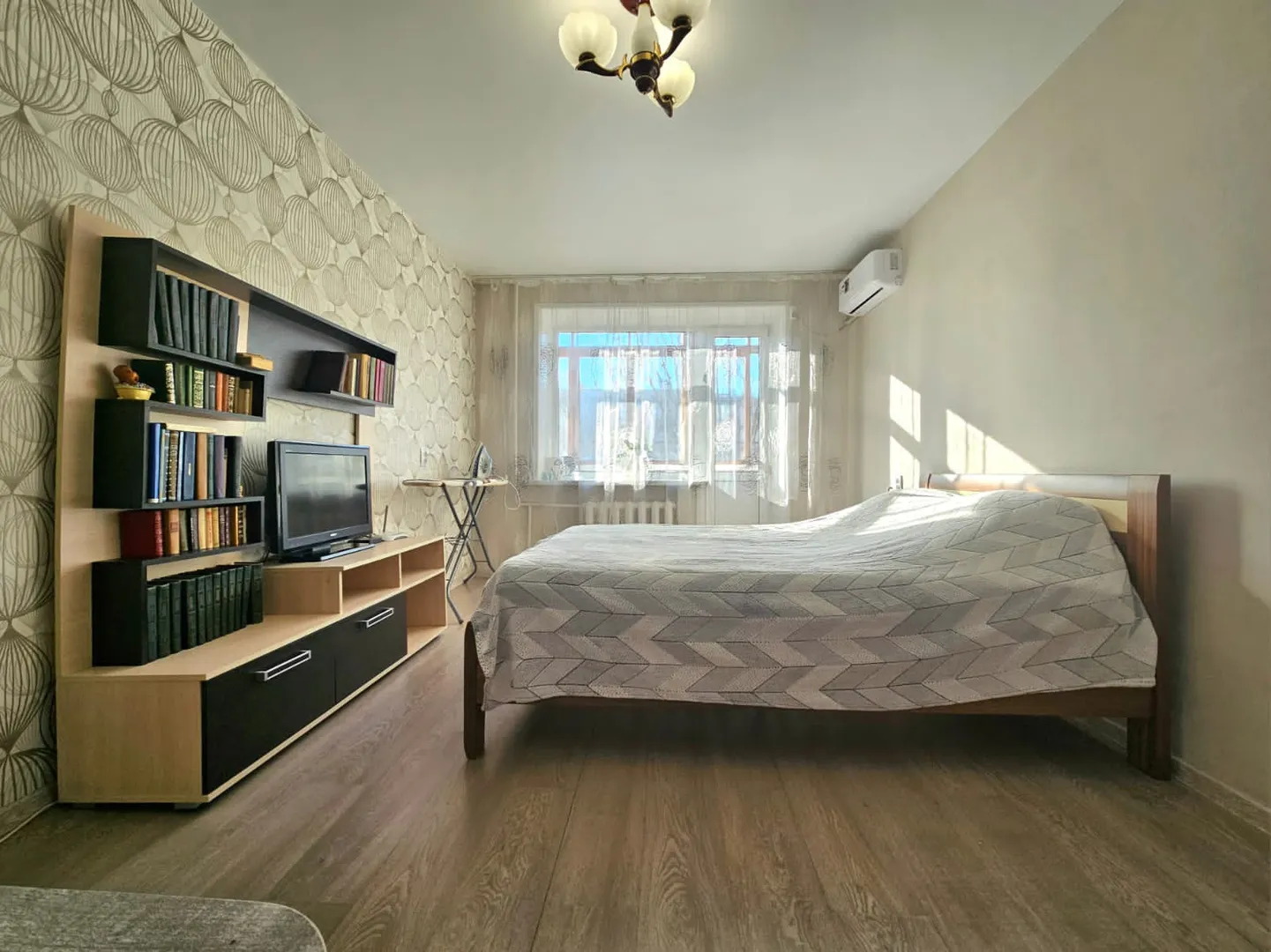 Уютная однокомнатная квартира, чистая, ухоженная. В квартире имеется диван, двуспальная кровать, шкаф, телевизор, журнальный столик, кухонный гарнитур, холодильник, плита, чайник, СВЧ, стол, 4 стула, стиральная машинка-автомат, титан, фен для волос, утюг, кондиционер. Есть интернет, телевидение Wink.